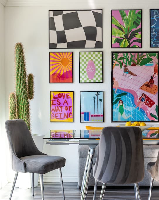 Step into a world of bold colors, pop art décor, and open-concept living. The home’s fully stocked kitchen, spacious dining area, and bright living room flow seamlessly together, creating the perfect backdrop for gathering with family and friends. -Master Suite: King bed + luxe en-suite bath with marble tile -Bedroom 2: Two twin beds -Bedroom 3: Two full beds -Bedroom 4: One queen bed Guest Bath: Shower/tub combo Every detail is designed for comfort, from plush beds to modern bathrooms stocked with essentials. 🌞 Outdoor Oasis Your private backyard was made for desert living. Spend your days lounging poolside, dipping into the bubbling hot tub, or soaking up sweeping south- and west-facing mountain views. ✨ Features include: -Large heated pool (no extra fee!) -Hot tub with stunning views -Outdoor Shower -Hammock + loungers for sunbathing -Gazebo for shaded relaxation -BBQ grill for cookouts -Fire pit for cozy evenings under the stars Pool floats for fun in the sun Bonus: You can even spot the world-famous Bob Hope House from the property. 🌟 Location Highlights Pop Art Oasis is perfectly located for both relaxation and adventure: 🚶♂️ 0.5 miles to Demuth Park ✈️ 0.6 miles to Palm Springs International Airport 🏌️ 1.8 miles to Tahquitz Creek Golf Course 🎤 2.8 miles to Palm Springs Convention Center 🌵 1-hour drive to Joshua Tree National Park 🚗 7 minutes, 2.3 miles going to Demuth Park Pickleball court 💡 Guest Perks Self-check-in with smart lock Complimentary fast WiFi Washer/dryer with detergent provided Free street & driveway parking Shampoo, conditioner & body wash included ⚠️ Things to Note NO extra charge for pool/spa heating Palm Springs enforces a strict no amplified outdoor music/noise ordinance (fines apply) Max overnight guests: 8 | Max daytime guests: 12 12.5% city tax applies for stays under 28 days (collected separately) Some airplane noise may be heard (the airport is just 3 minutes away) Where you’ll be Neighborhood highlights Walking distance to playgrounds, racquetball, & indoor A/C basketball court! 0.5 miles from Demuth Park 0.6 miles from Palm Springs International Airport 1.8 miles from Tahquitz Creek Golf Course 2.8 miles from Palm Springs Convention Center