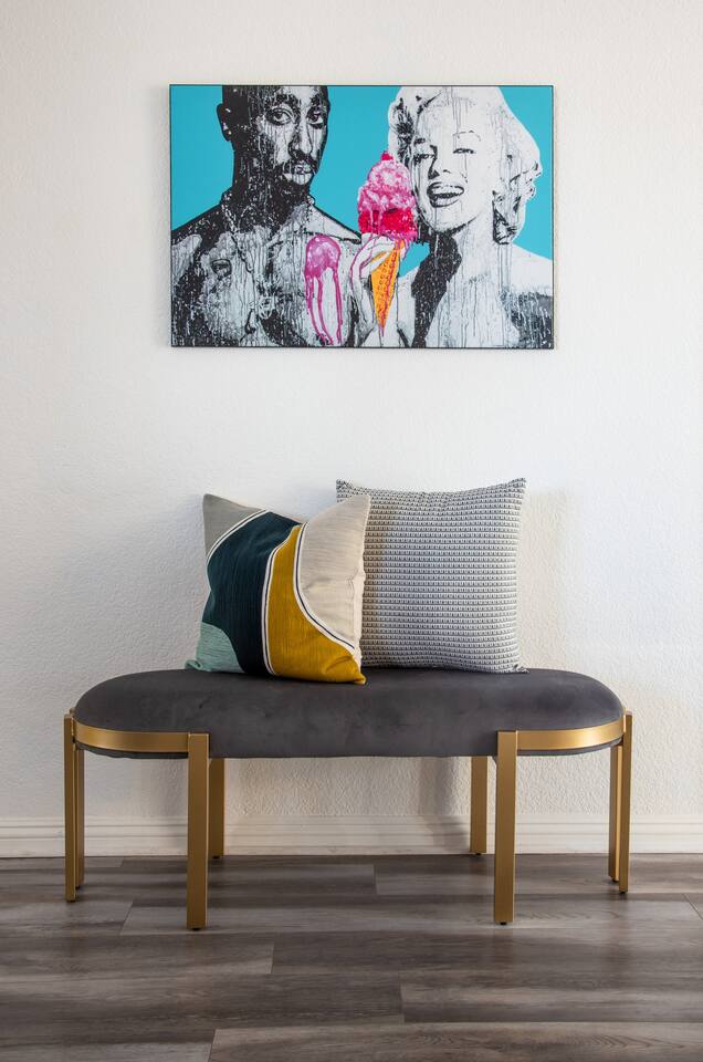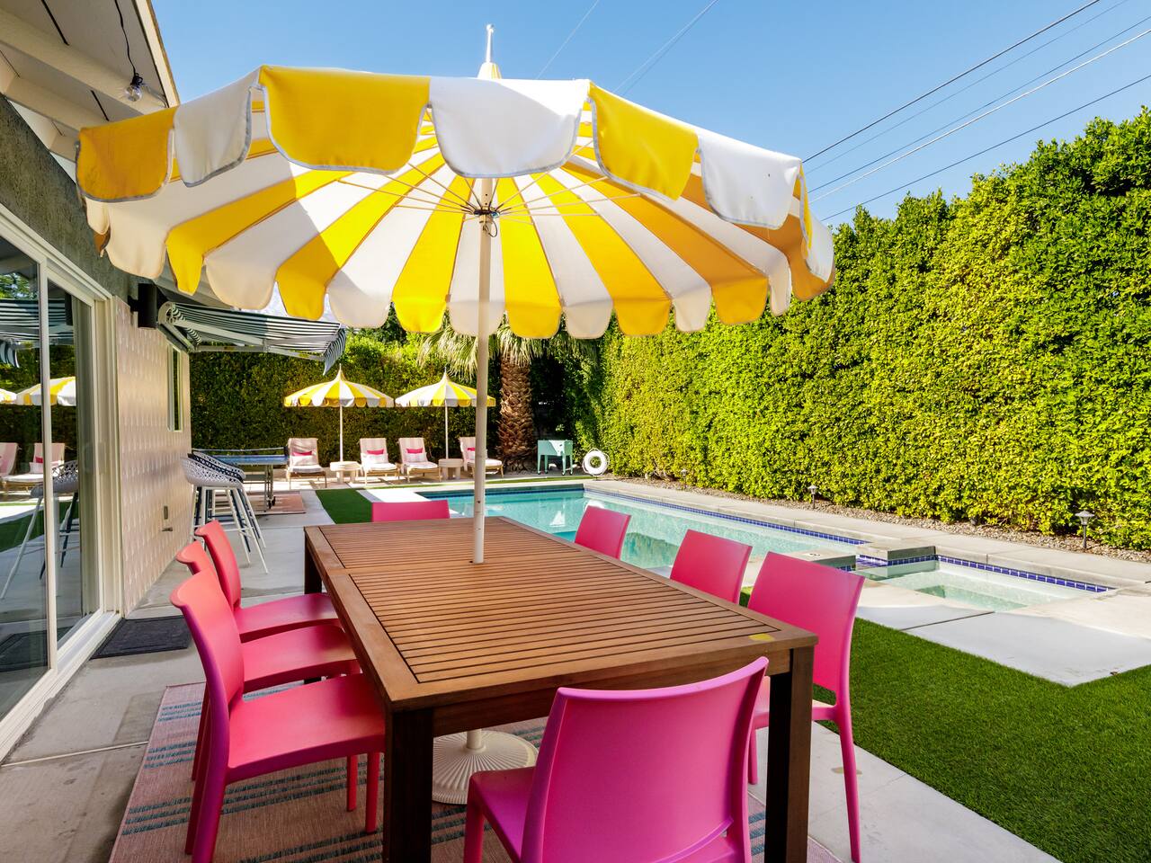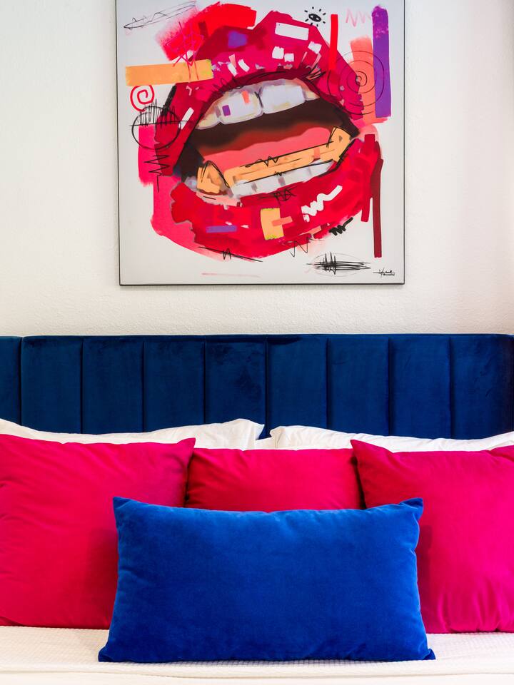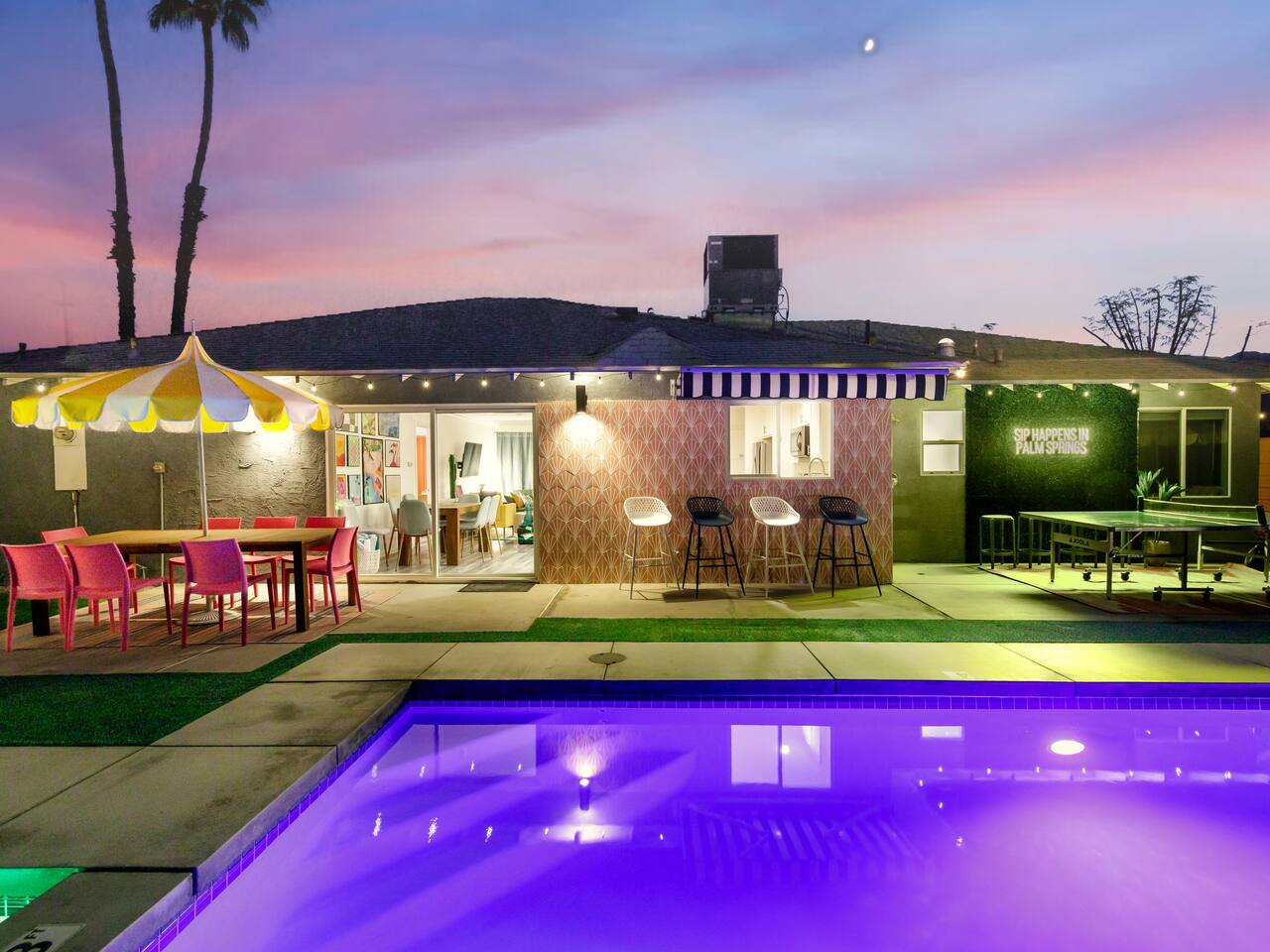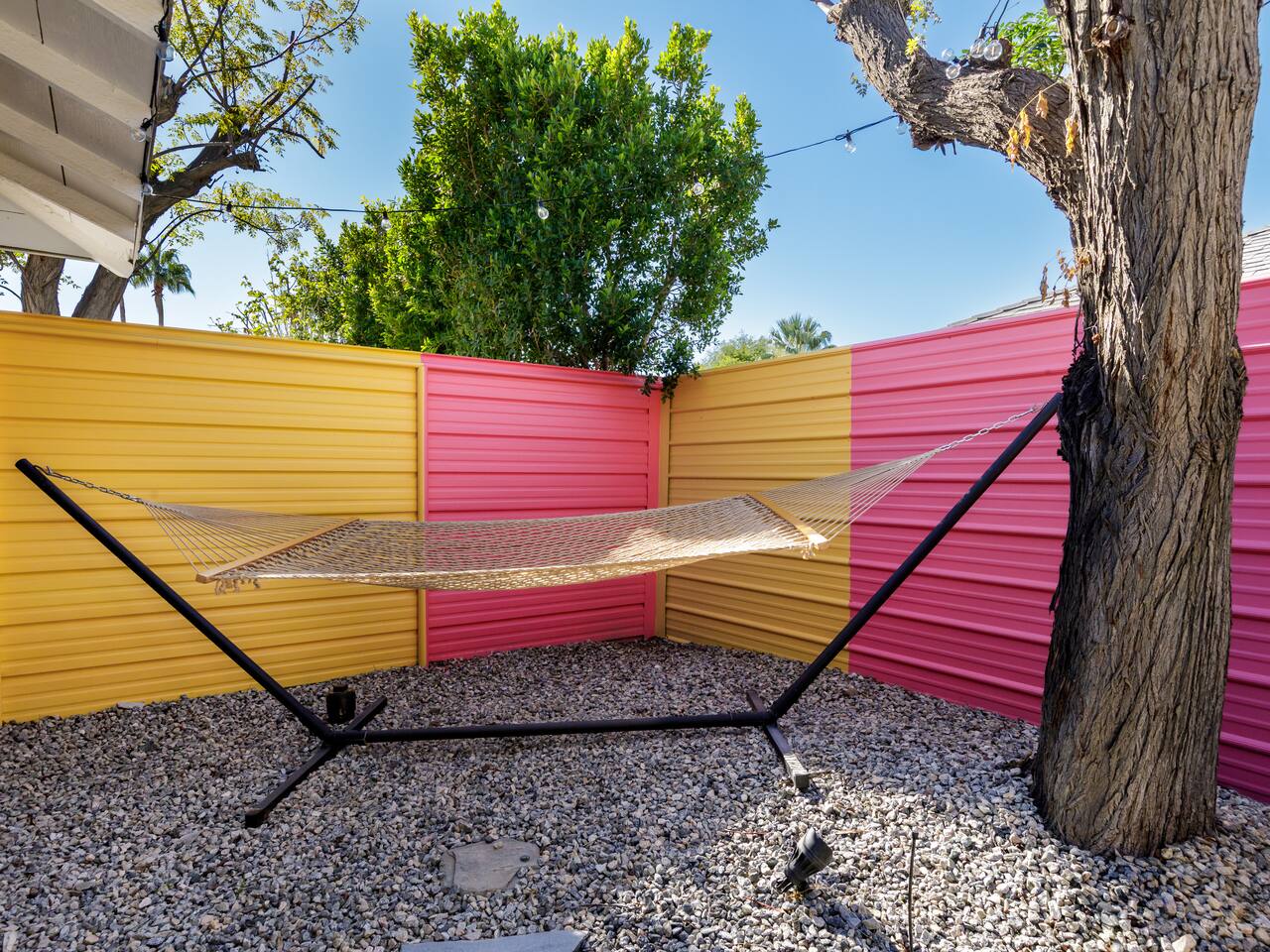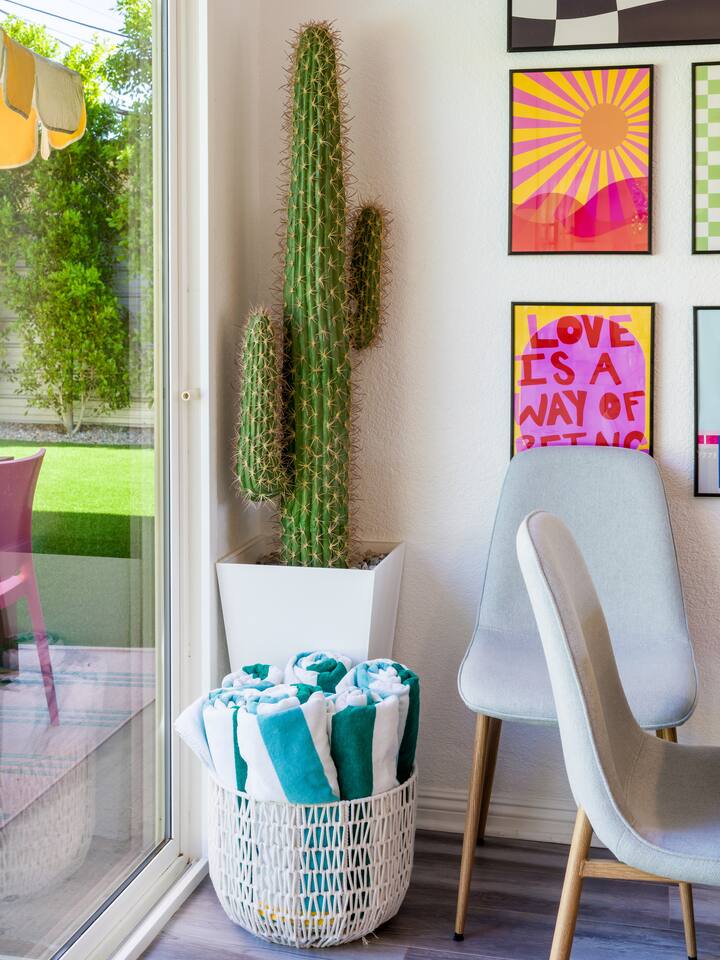 Step into a world of bold colors, pop art décor, and open-concept living. The home’s fully stocked kitchen, spacious dining area, and bright living room flow seamlessly together, creating the perfect backdrop for gathering with family and friends. -Master Suite: King bed + luxe en-suite bath with marble tile -Bedroom 2: Two twin beds -Bedroom 3: Two full beds -Bedroom 4: One queen bed Guest Bath: Shower/tub combo Every detail is designed for comfort, from plush beds to modern bathrooms stocked with essentials. 🌞 Outdoor Oasis Your private backyard was made for desert living. Spend your days lounging poolside, dipping into the bubbling hot tub, or soaking up sweeping south- and west-facing mountain views. ✨ Features include: -Large heated pool (no extra fee!) -Hot tub with stunning views -Outdoor Shower -Hammock + loungers for sunbathing -Gazebo for shaded relaxation -BBQ grill for cookouts -Fire pit for cozy evenings under the stars Pool floats for fun in the sun Bonus: You can even spot the world-famous Bob Hope House from the property. 🌟 Location Highlights Pop Art Oasis is perfectly located for both relaxation and adventure: 🚶♂️ 0.5 miles to Demuth Park ✈️ 0.6 miles to Palm Springs International Airport 🏌️ 1.8 miles to Tahquitz Creek Golf Course 🎤 2.8 miles to Palm Springs Convention Center 🌵 1-hour drive to Joshua Tree National Park 🚗 7 minutes, 2.3 miles going to Demuth Park Pickleball court 💡 Guest Perks Self-check-in with smart lock Complimentary fast WiFi Washer/dryer with detergent provided Free street & driveway parking Shampoo, conditioner & body wash included ⚠️ Things to Note NO extra charge for pool/spa heating Palm Springs enforces a strict no amplified outdoor music/noise ordinance (fines apply) Max overnight guests: 8 | Max daytime guests: 12 12.5% city tax applies for stays under 28 days (collected separately) Some airplane noise may be heard (the airport is just 3 minutes away) Where you’ll be Neighborhood highlights Walking distance to playgrounds, racquetball, & indoor A/C basketball court! 0.5 miles from Demuth Park 0.6 miles from Palm Springs International Airport 1.8 miles from Tahquitz Creek Golf Course 2.8 miles from Palm Springs Convention Center