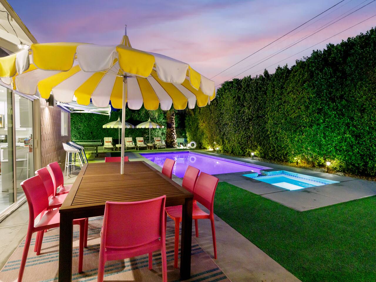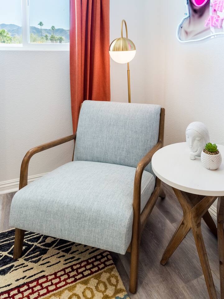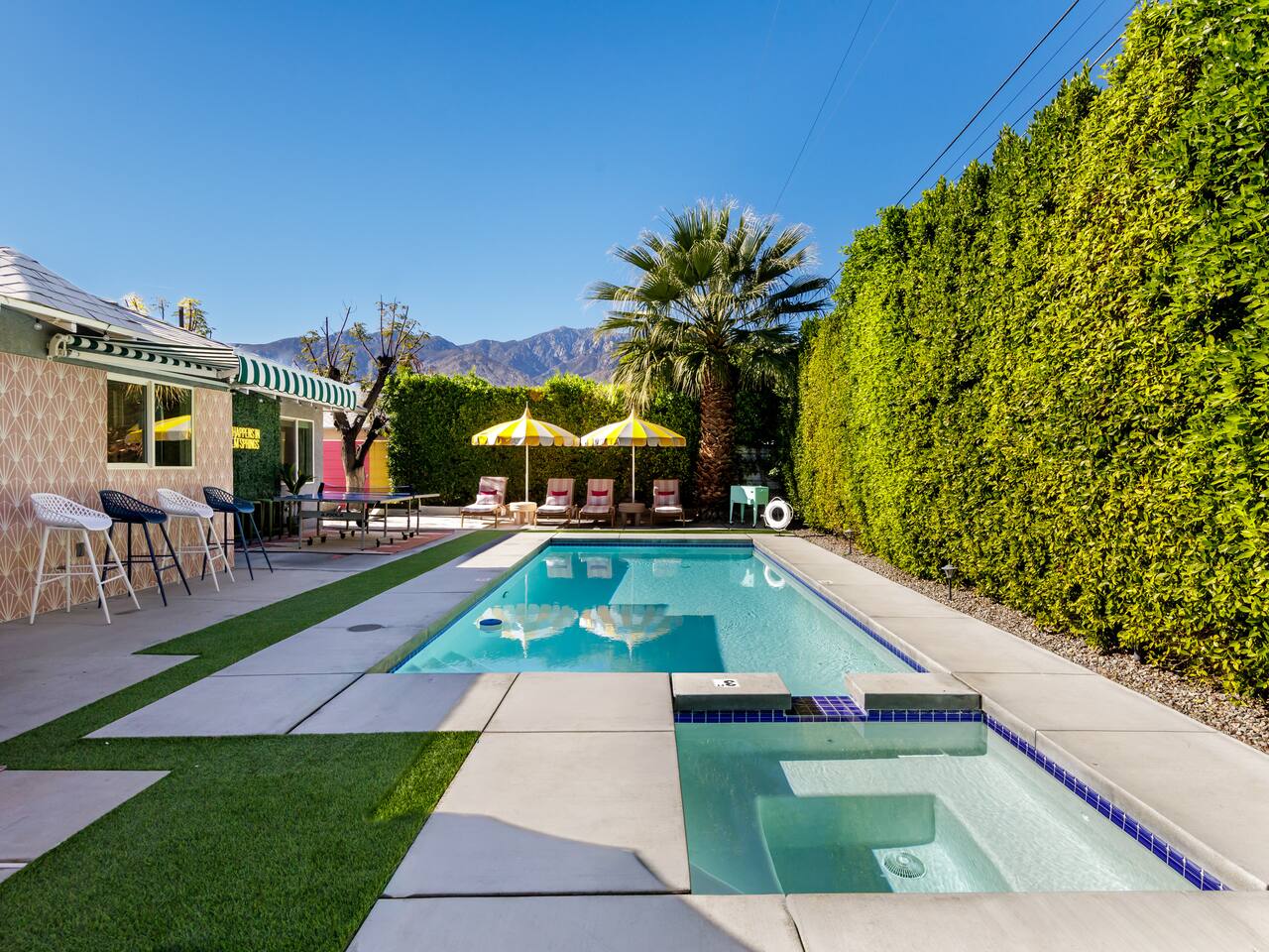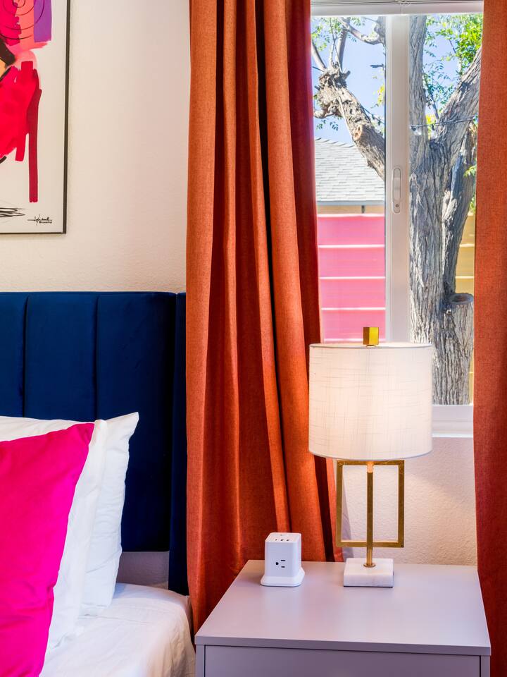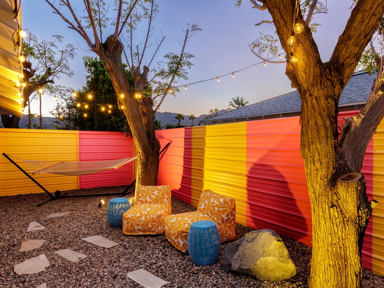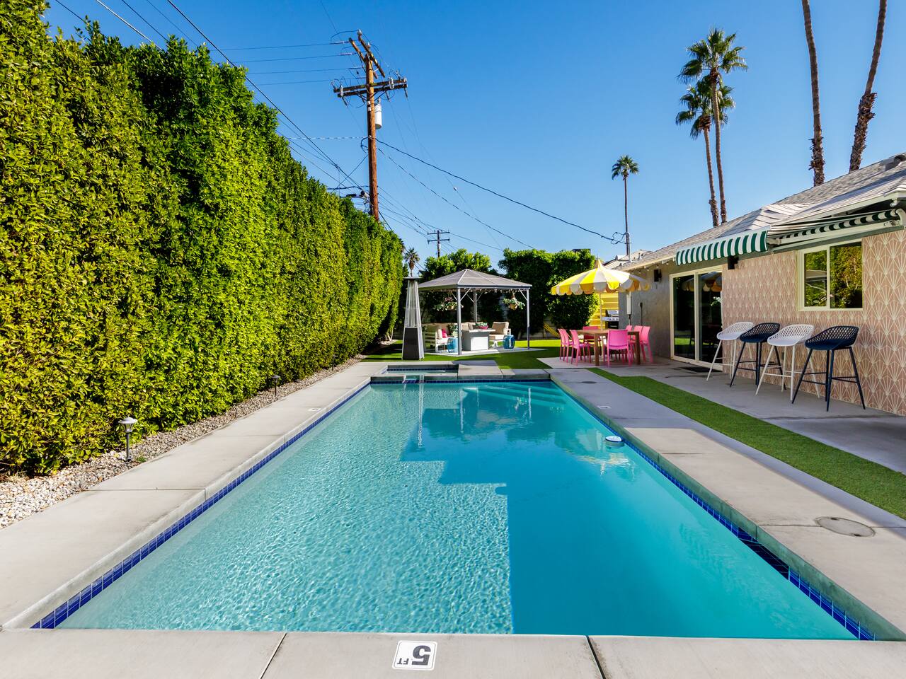 Step into a world of bold colors, pop art décor, and open-concept living. The home’s fully stocked kitchen, spacious dining area, and bright living room flow seamlessly together, creating the perfect backdrop for gathering with family and friends. -Master Suite: King bed + luxe en-suite bath with marble tile -Bedroom 2: Two twin beds -Bedroom 3: Two full beds -Bedroom 4: One queen bed Guest Bath: Shower/tub combo Every detail is designed for comfort, from plush beds to modern bathrooms stocked with essentials. 🌞 Outdoor Oasis Your private backyard was made for desert living. Spend your days lounging poolside, dipping into the bubbling hot tub, or soaking up sweeping south- and west-facing mountain views. ✨ Features include: -Large heated pool (no extra fee!) -Hot tub with stunning views -Outdoor Shower -Hammock + loungers for sunbathing -Gazebo for shaded relaxation -BBQ grill for cookouts -Fire pit for cozy evenings under the stars Pool floats for fun in the sun Bonus: You can even spot the world-famous Bob Hope House from the property. 🌟 Location Highlights Pop Art Oasis is perfectly located for both relaxation and adventure: 🚶♂️ 0.5 miles to Demuth Park ✈️ 0.6 miles to Palm Springs International Airport 🏌️ 1.8 miles to Tahquitz Creek Golf Course 🎤 2.8 miles to Palm Springs Convention Center 🌵 1-hour drive to Joshua Tree National Park 🚗 7 minutes, 2.3 miles going to Demuth Park Pickleball court 💡 Guest Perks Self-check-in with smart lock Complimentary fast WiFi Washer/dryer with detergent provided Free street & driveway parking Shampoo, conditioner & body wash included ⚠️ Things to Note NO extra charge for pool/spa heating Palm Springs enforces a strict no amplified outdoor music/noise ordinance (fines apply) Max overnight guests: 8 | Max daytime guests: 12 12.5% city tax applies for stays under 28 days (collected separately) Some airplane noise may be heard (the airport is just 3 minutes away) Where you’ll be Neighborhood highlights Walking distance to playgrounds, racquetball, & indoor A/C basketball court! 0.5 miles from Demuth Park 0.6 miles from Palm Springs International Airport 1.8 miles from Tahquitz Creek Golf Course 2.8 miles from Palm Springs Convention Center