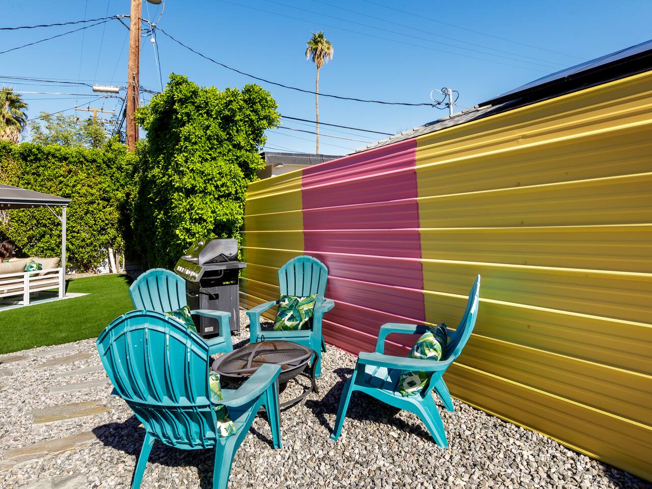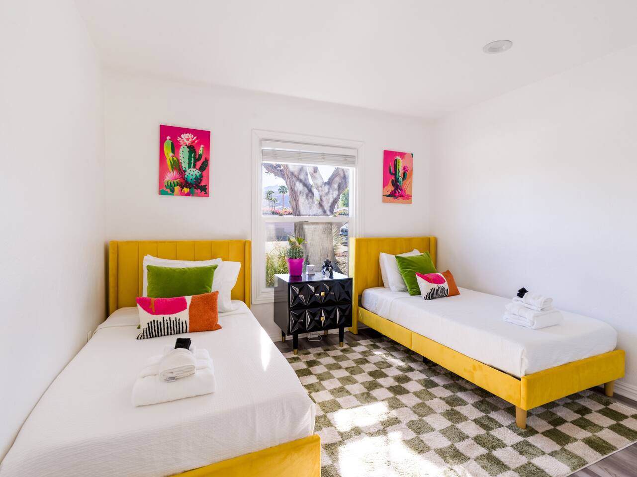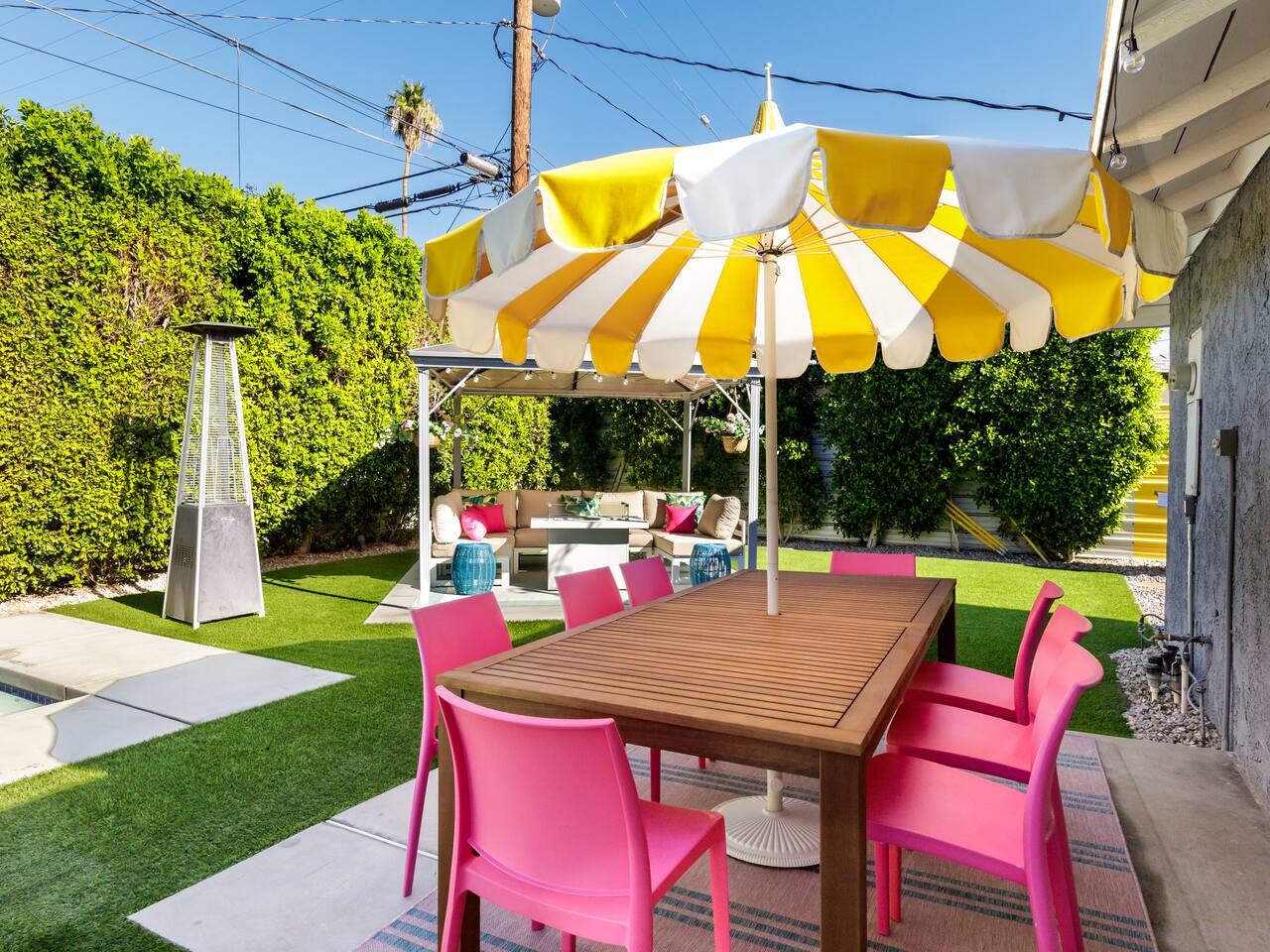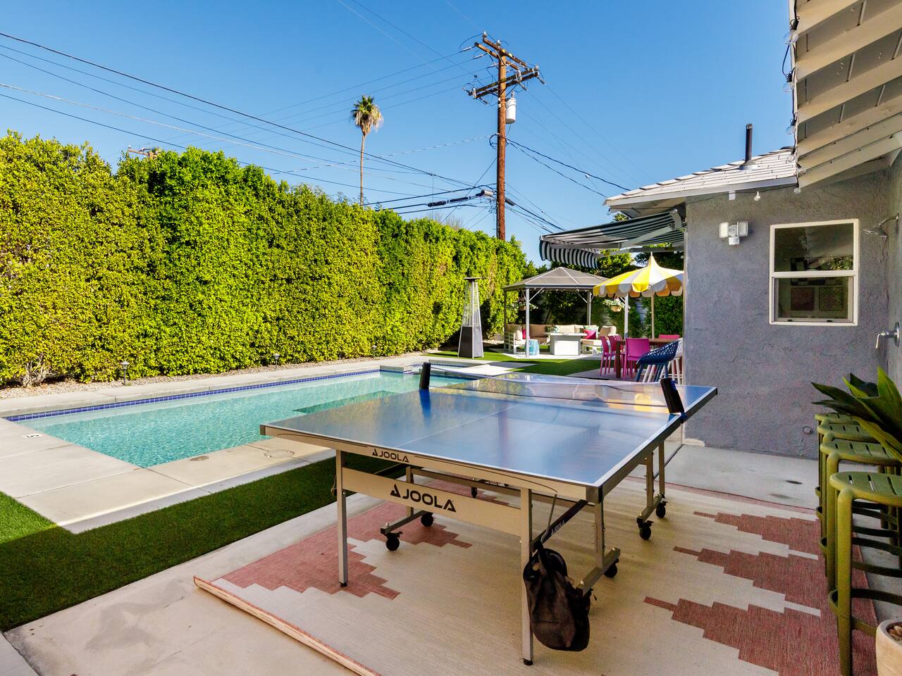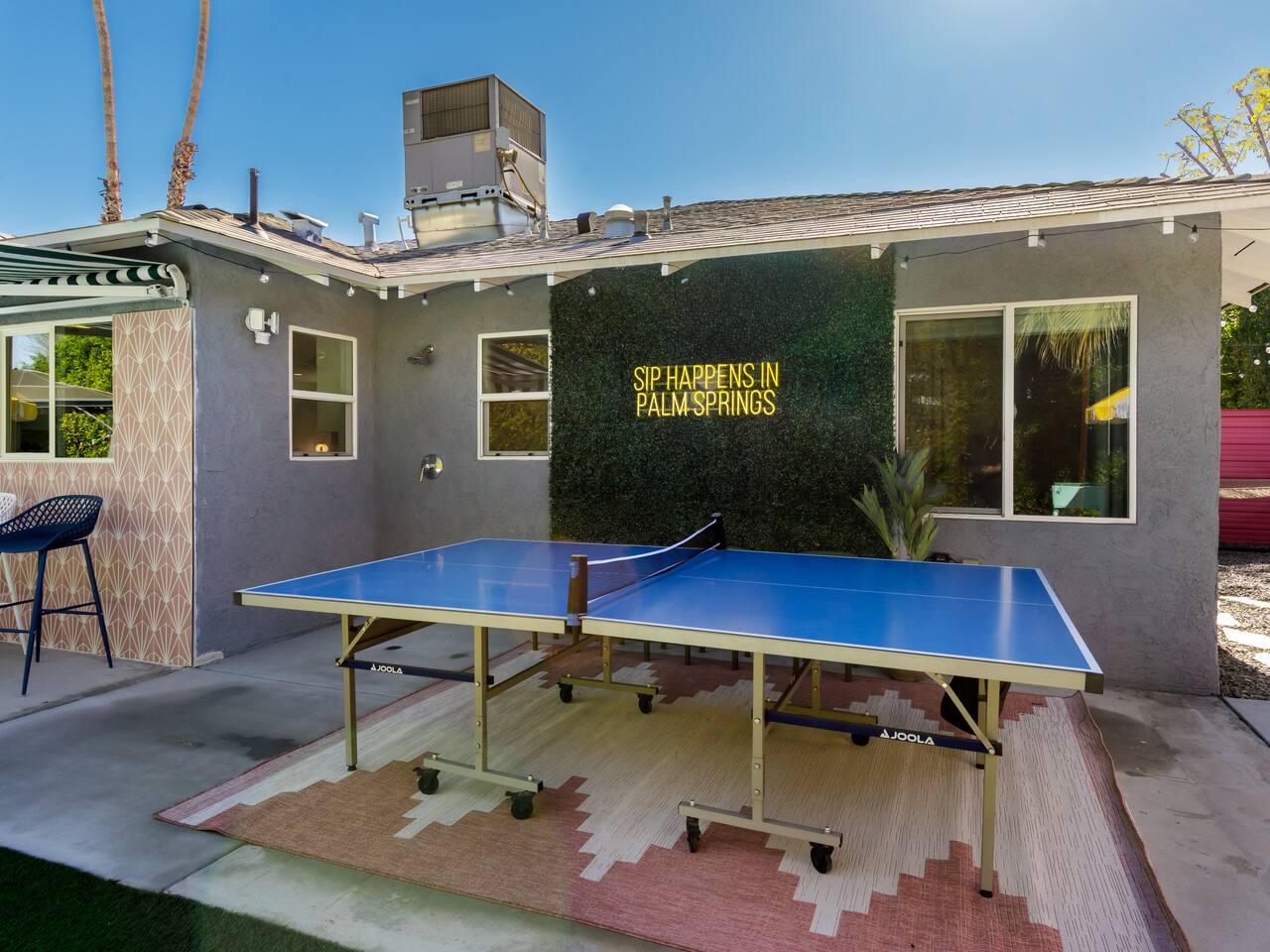 Step into a world of bold colors, pop art décor, and open-concept living. The home’s fully stocked kitchen, spacious dining area, and bright living room flow seamlessly together, creating the perfect backdrop for gathering with family and friends. -Master Suite: King bed + luxe en-suite bath with marble tile -Bedroom 2: Two twin beds -Bedroom 3: Two full beds -Bedroom 4: One queen bed Guest Bath: Shower/tub combo Every detail is designed for comfort, from plush beds to modern bathrooms stocked with essentials. 🌞 Outdoor Oasis Your private backyard was made for desert living. Spend your days lounging poolside, dipping into the bubbling hot tub, or soaking up sweeping south- and west-facing mountain views. ✨ Features include: -Large heated pool (no extra fee!) -Hot tub with stunning views -Outdoor Shower -Hammock + loungers for sunbathing -Gazebo for shaded relaxation -BBQ grill for cookouts -Fire pit for cozy evenings under the stars Pool floats for fun in the sun Bonus: You can even spot the world-famous Bob Hope House from the property. 🌟 Location Highlights Pop Art Oasis is perfectly located for both relaxation and adventure: 🚶♂️ 0.5 miles to Demuth Park ✈️ 0.6 miles to Palm Springs International Airport 🏌️ 1.8 miles to Tahquitz Creek Golf Course 🎤 2.8 miles to Palm Springs Convention Center 🌵 1-hour drive to Joshua Tree National Park 🚗 7 minutes, 2.3 miles going to Demuth Park Pickleball court 💡 Guest Perks Self-check-in with smart lock Complimentary fast WiFi Washer/dryer with detergent provided Free street & driveway parking Shampoo, conditioner & body wash included ⚠️ Things to Note NO extra charge for pool/spa heating Palm Springs enforces a strict no amplified outdoor music/noise ordinance (fines apply) Max overnight guests: 8 | Max daytime guests: 12 12.5% city tax applies for stays under 28 days (collected separately) Some airplane noise may be heard (the airport is just 3 minutes away) Where you’ll be Neighborhood highlights Walking distance to playgrounds, racquetball, & indoor A/C basketball court! 0.5 miles from Demuth Park 0.6 miles from Palm Springs International Airport 1.8 miles from Tahquitz Creek Golf Course 2.8 miles from Palm Springs Convention Center