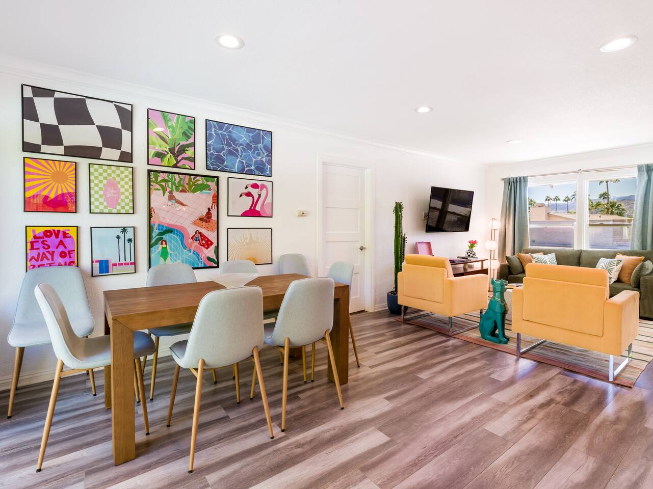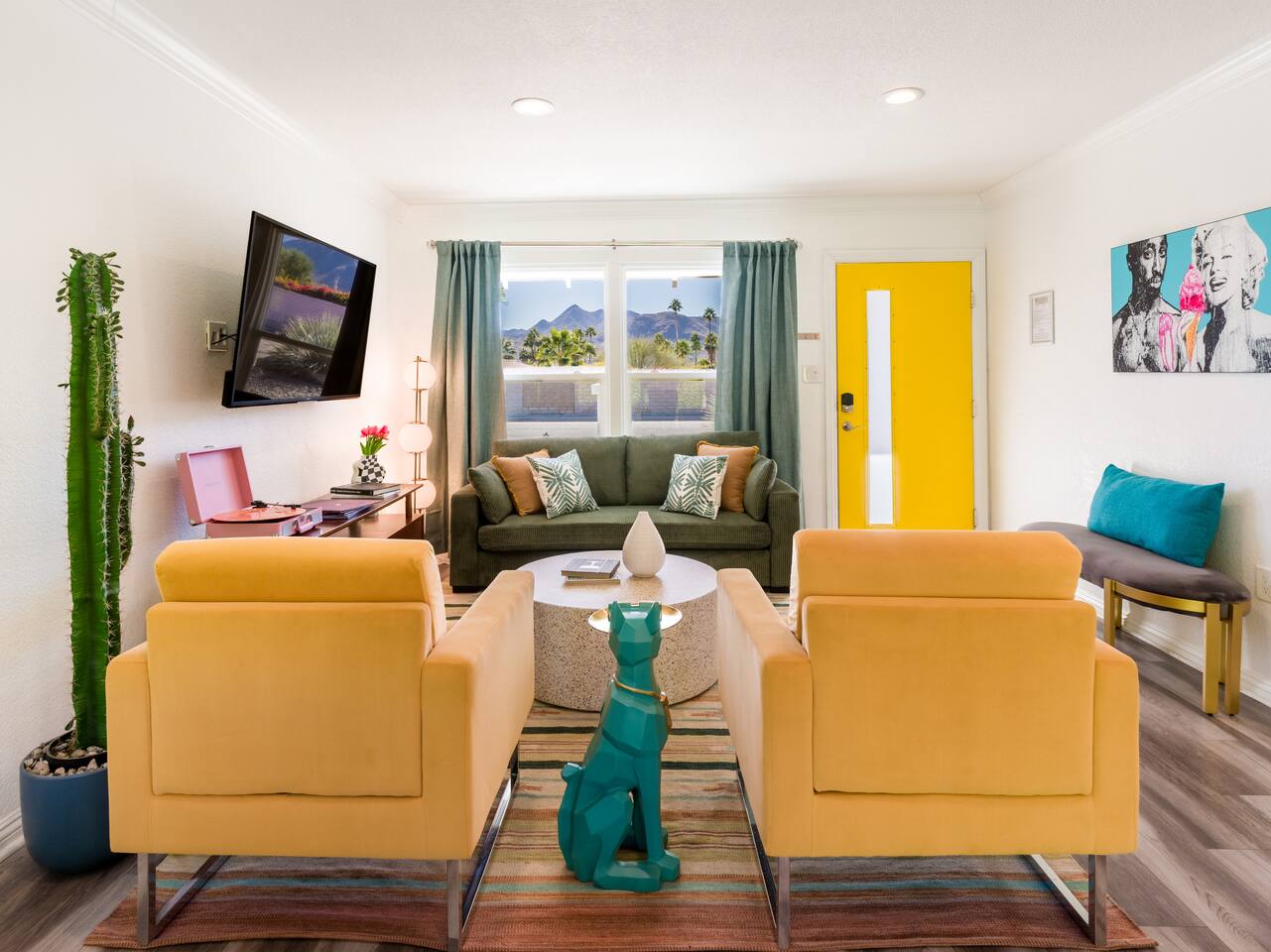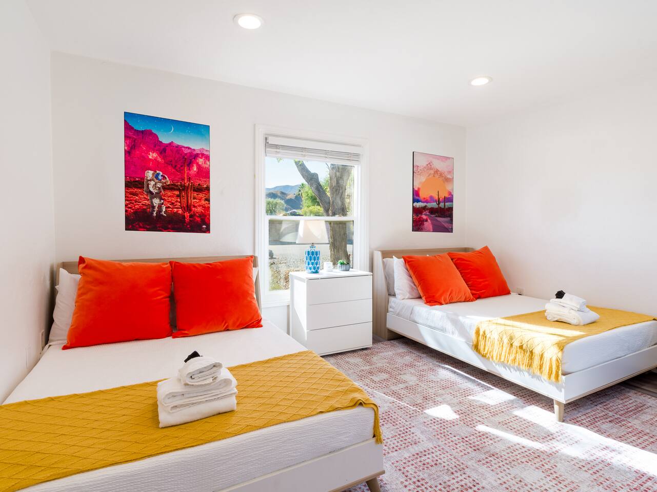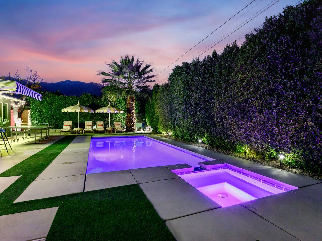Step into a world of bold colors, pop art décor, and open-concept living. The home’s fully stocked kitchen, spacious dining area, and bright living room flow seamlessly together, creating the perfect backdrop for gathering with family and friends. -Master Suite: King bed + luxe en-suite bath with marble tile -Bedroom 2: Two twin beds -Bedroom 3: Two full beds -Bedroom 4: One queen bed Guest Bath: Shower/tub combo Every detail is designed for comfort, from plush beds to modern bathrooms stocked with essentials. 🌞 Outdoor Oasis Your private backyard was made for desert living. Spend your days lounging poolside, dipping into the bubbling hot tub, or soaking up sweeping south- and west-facing mountain views. ✨ Features include: -Large heated pool (no extra fee!) -Hot tub with stunning views -Outdoor Shower -Hammock + loungers for sunbathing -Gazebo for shaded relaxation -BBQ grill for cookouts -Fire pit for cozy evenings under the stars Pool floats for fun in the sun Bonus: You can even spot the world-famous Bob Hope House from the property. 🌟 Location Highlights Pop Art Oasis is perfectly located for both relaxation and adventure: 🚶♂️ 0.5 miles to Demuth Park ✈️ 0.6 miles to Palm Springs International Airport 🏌️ 1.8 miles to Tahquitz Creek Golf Course 🎤 2.8 miles to Palm Springs Convention Center 🌵 1-hour drive to Joshua Tree National Park 🚗 7 minutes, 2.3 miles going to Demuth Park Pickleball court 💡 Guest Perks Self-check-in with smart lock Complimentary fast WiFi Washer/dryer with detergent provided Free street & driveway parking Shampoo, conditioner & body wash included ⚠️ Things to Note NO extra charge for pool/spa heating Palm Springs enforces a strict no amplified outdoor music/noise ordinance (fines apply) Max overnight guests: 8 | Max daytime guests: 12 12.5% city tax applies for stays under 28 days (collected separately) Some airplane noise may be heard (the airport is just 3 minutes away) Where you’ll be Neighborhood highlights Walking distance to playgrounds, racquetball, & indoor A/C basketball court! 0.5 miles from Demuth Park 0.6 miles from Palm Springs International Airport 1.8 miles from Tahquitz Creek Golf Course 2.8 miles from Palm Springs Convention Center