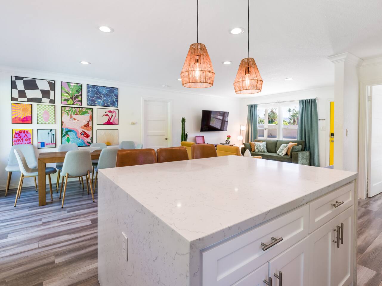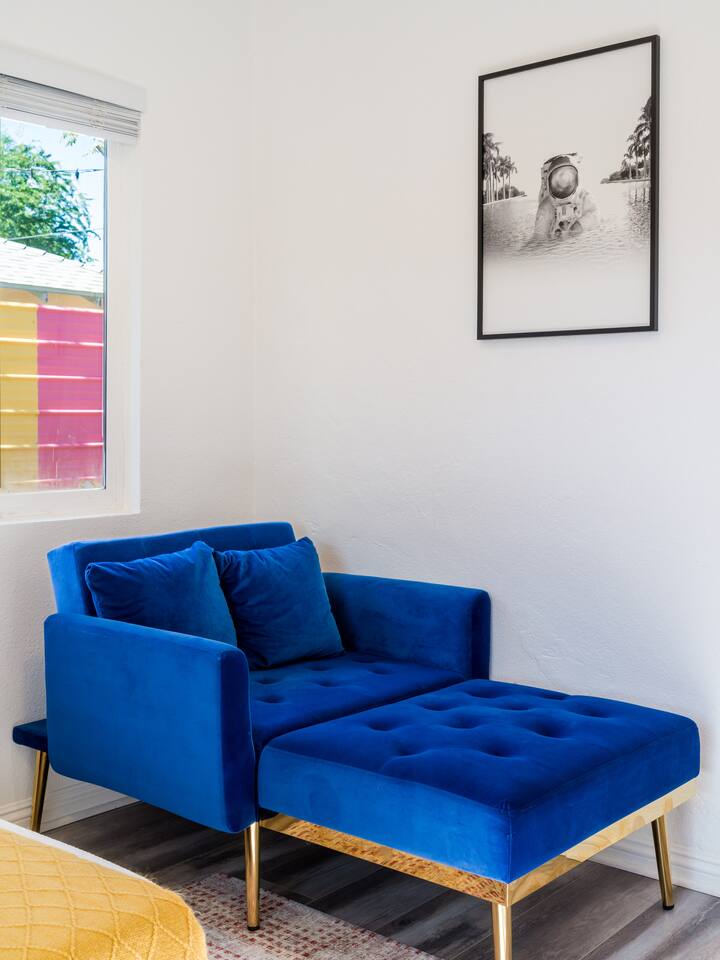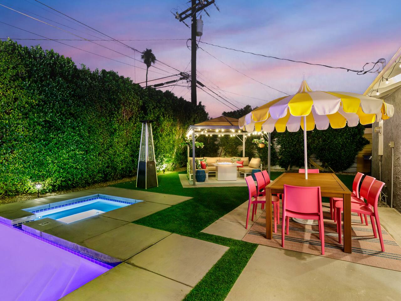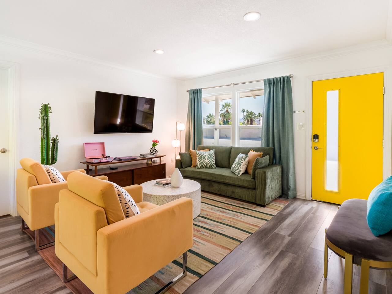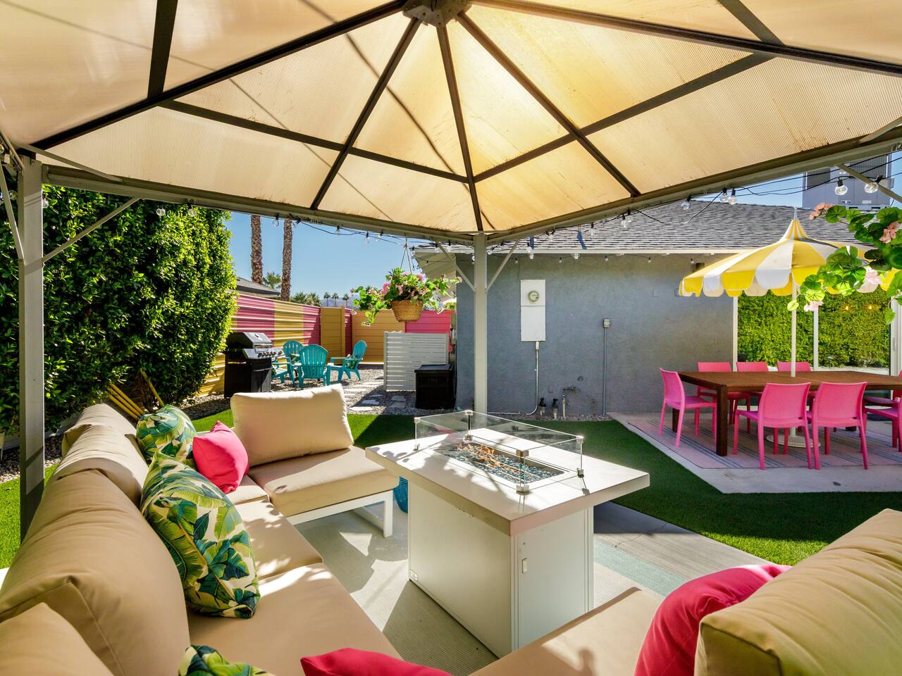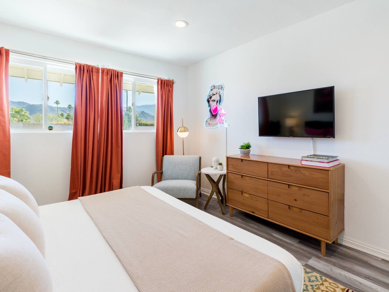 Step into a world of bold colors, pop art décor, and open-concept living. The home’s fully stocked kitchen, spacious dining area, and bright living room flow seamlessly together, creating the perfect backdrop for gathering with family and friends. -Master Suite: King bed + luxe en-suite bath with marble tile -Bedroom 2: Two twin beds -Bedroom 3: Two full beds -Bedroom 4: One queen bed Guest Bath: Shower/tub combo Every detail is designed for comfort, from plush beds to modern bathrooms stocked with essentials. 🌞 Outdoor Oasis Your private backyard was made for desert living. Spend your days lounging poolside, dipping into the bubbling hot tub, or soaking up sweeping south- and west-facing mountain views. ✨ Features include: -Large heated pool (no extra fee!) -Hot tub with stunning views -Outdoor Shower -Hammock + loungers for sunbathing -Gazebo for shaded relaxation -BBQ grill for cookouts -Fire pit for cozy evenings under the stars Pool floats for fun in the sun Bonus: You can even spot the world-famous Bob Hope House from the property. 🌟 Location Highlights Pop Art Oasis is perfectly located for both relaxation and adventure: 🚶♂️ 0.5 miles to Demuth Park ✈️ 0.6 miles to Palm Springs International Airport 🏌️ 1.8 miles to Tahquitz Creek Golf Course 🎤 2.8 miles to Palm Springs Convention Center 🌵 1-hour drive to Joshua Tree National Park 🚗 7 minutes, 2.3 miles going to Demuth Park Pickleball court 💡 Guest Perks Self-check-in with smart lock Complimentary fast WiFi Washer/dryer with detergent provided Free street & driveway parking Shampoo, conditioner & body wash included ⚠️ Things to Note NO extra charge for pool/spa heating Palm Springs enforces a strict no amplified outdoor music/noise ordinance (fines apply) Max overnight guests: 8 | Max daytime guests: 12 12.5% city tax applies for stays under 28 days (collected separately) Some airplane noise may be heard (the airport is just 3 minutes away) Where you’ll be Neighborhood highlights Walking distance to playgrounds, racquetball, & indoor A/C basketball court! 0.5 miles from Demuth Park 0.6 miles from Palm Springs International Airport 1.8 miles from Tahquitz Creek Golf Course 2.8 miles from Palm Springs Convention Center