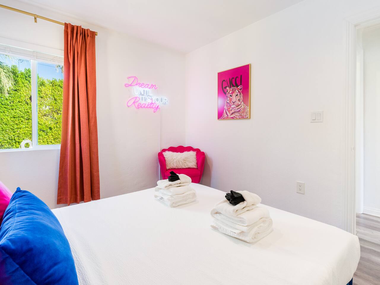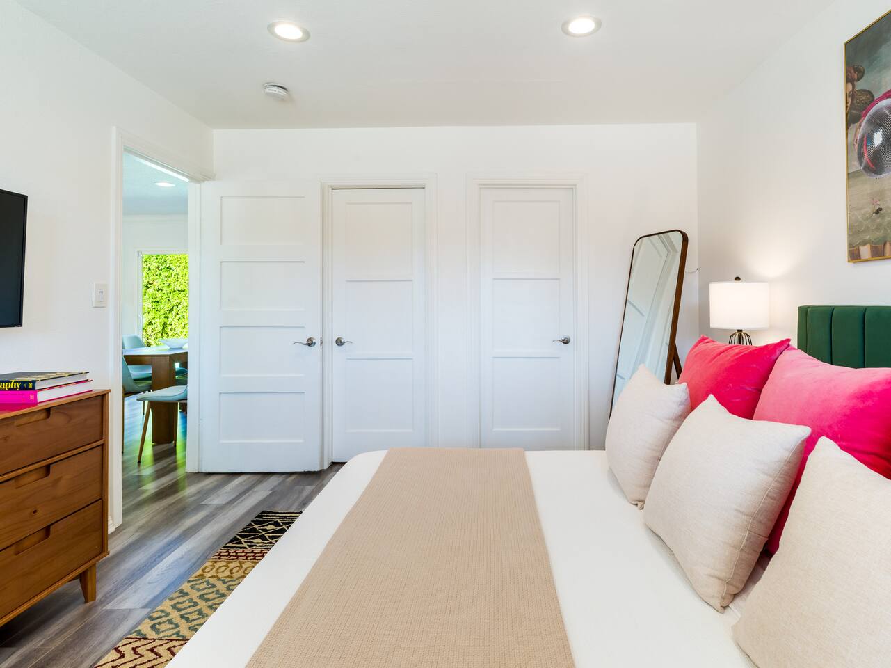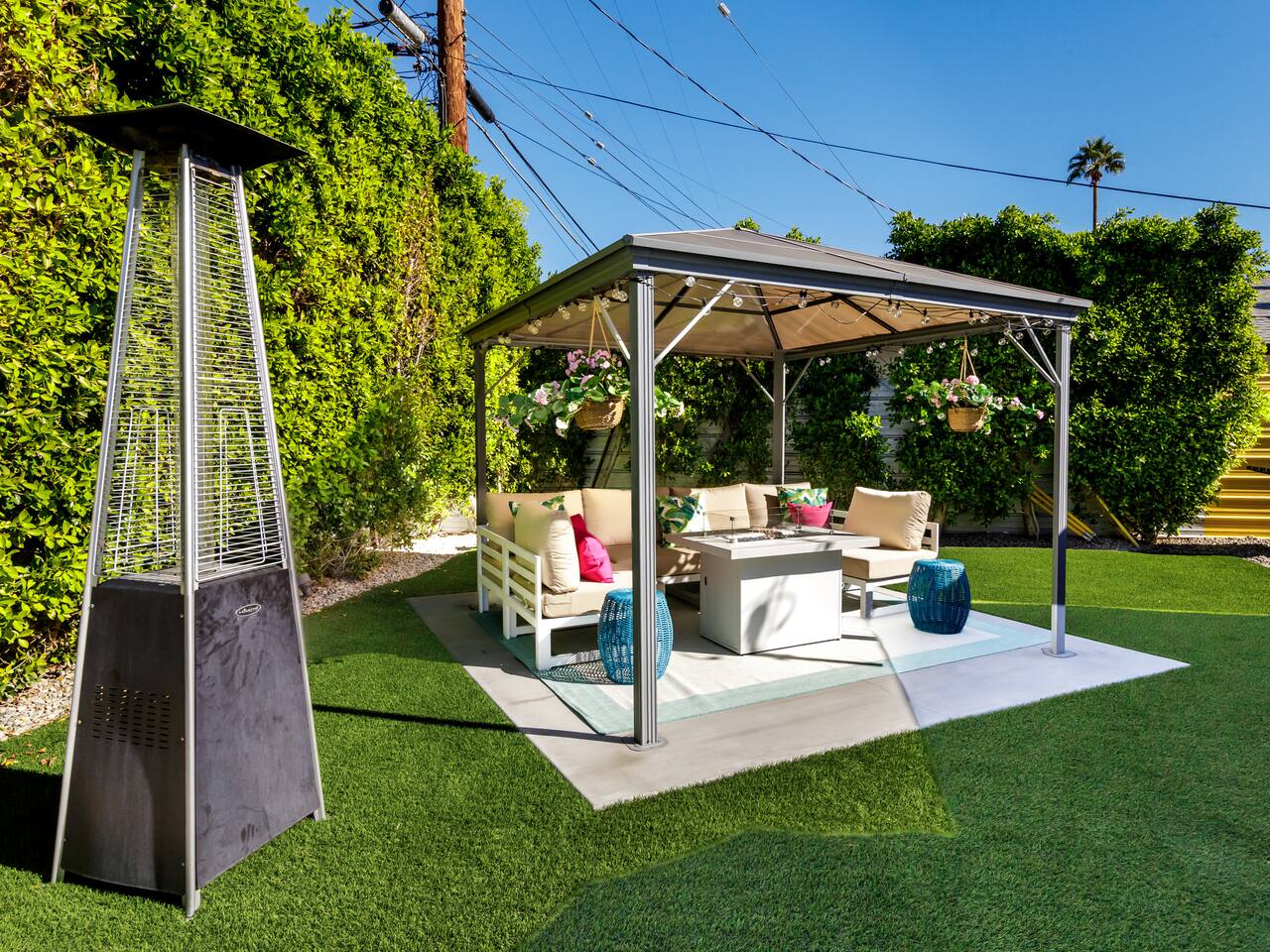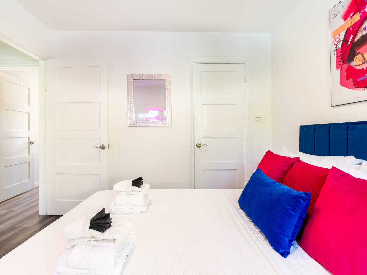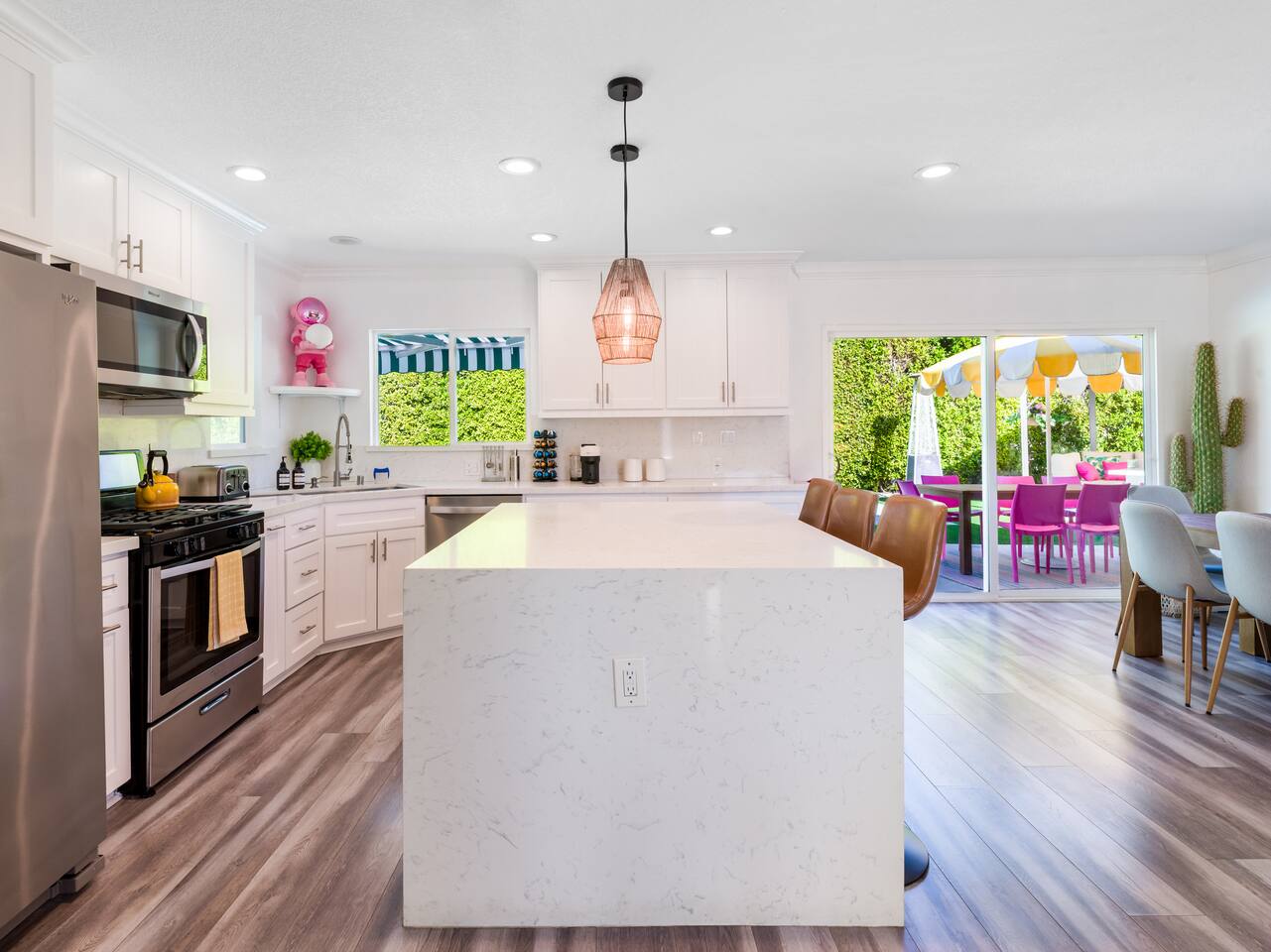 Step into a world of bold colors, pop art décor, and open-concept living. The home’s fully stocked kitchen, spacious dining area, and bright living room flow seamlessly together, creating the perfect backdrop for gathering with family and friends. -Master Suite: King bed + luxe en-suite bath with marble tile -Bedroom 2: Two twin beds -Bedroom 3: Two full beds -Bedroom 4: One queen bed Guest Bath: Shower/tub combo Every detail is designed for comfort, from plush beds to modern bathrooms stocked with essentials. 🌞 Outdoor Oasis Your private backyard was made for desert living. Spend your days lounging poolside, dipping into the bubbling hot tub, or soaking up sweeping south- and west-facing mountain views. ✨ Features include: -Large heated pool (no extra fee!) -Hot tub with stunning views -Outdoor Shower -Hammock + loungers for sunbathing -Gazebo for shaded relaxation -BBQ grill for cookouts -Fire pit for cozy evenings under the stars Pool floats for fun in the sun Bonus: You can even spot the world-famous Bob Hope House from the property. 🌟 Location Highlights Pop Art Oasis is perfectly located for both relaxation and adventure: 🚶♂️ 0.5 miles to Demuth Park ✈️ 0.6 miles to Palm Springs International Airport 🏌️ 1.8 miles to Tahquitz Creek Golf Course 🎤 2.8 miles to Palm Springs Convention Center 🌵 1-hour drive to Joshua Tree National Park 🚗 7 minutes, 2.3 miles going to Demuth Park Pickleball court 💡 Guest Perks Self-check-in with smart lock Complimentary fast WiFi Washer/dryer with detergent provided Free street & driveway parking Shampoo, conditioner & body wash included ⚠️ Things to Note NO extra charge for pool/spa heating Palm Springs enforces a strict no amplified outdoor music/noise ordinance (fines apply) Max overnight guests: 8 | Max daytime guests: 12 12.5% city tax applies for stays under 28 days (collected separately) Some airplane noise may be heard (the airport is just 3 minutes away) Where you’ll be Neighborhood highlights Walking distance to playgrounds, racquetball, & indoor A/C basketball court! 0.5 miles from Demuth Park 0.6 miles from Palm Springs International Airport 1.8 miles from Tahquitz Creek Golf Course 2.8 miles from Palm Springs Convention Center