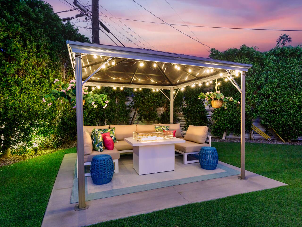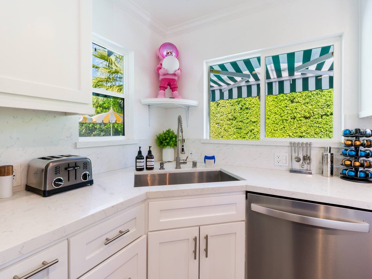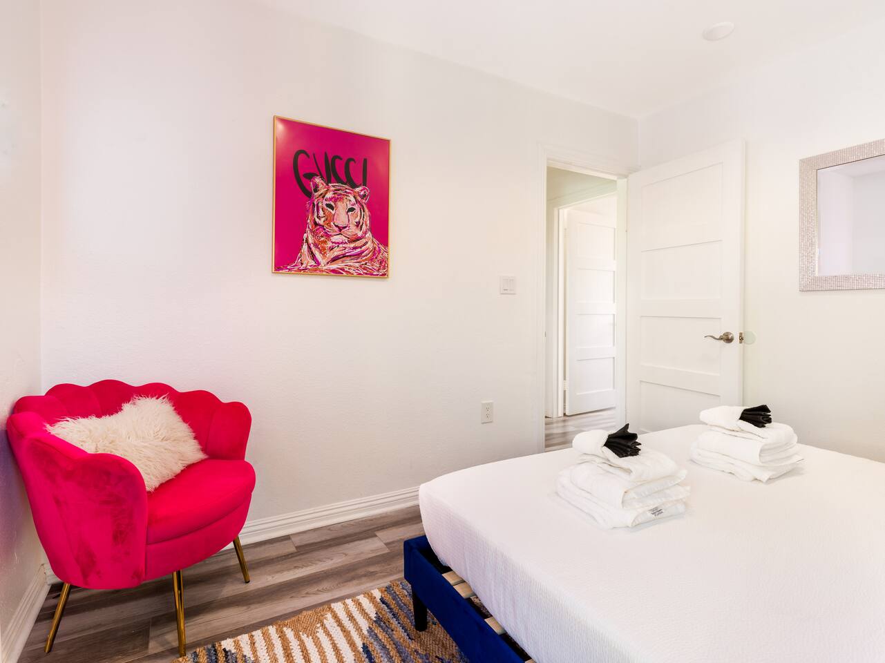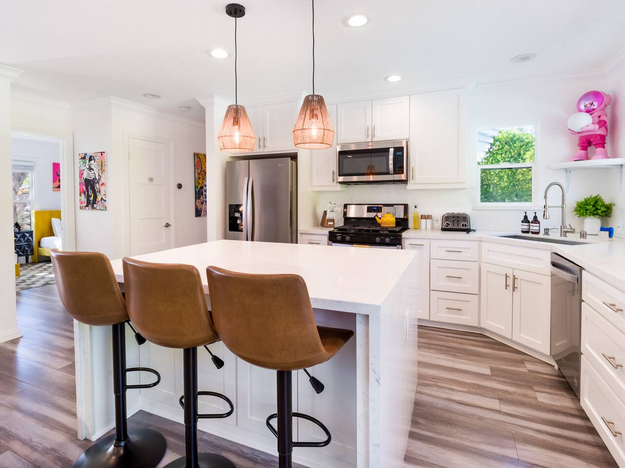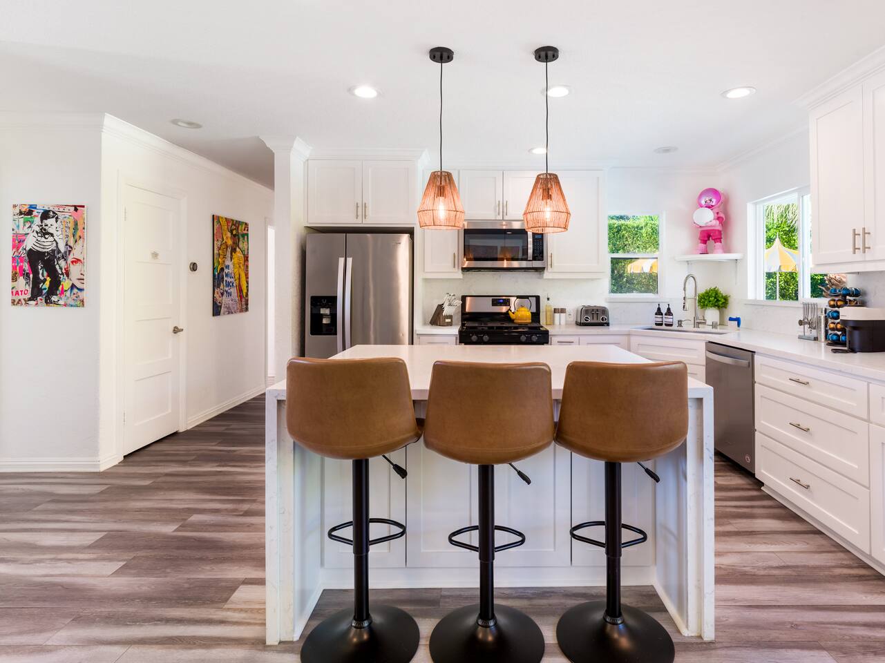 Step into a world of bold colors, pop art décor, and open-concept living. The home’s fully stocked kitchen, spacious dining area, and bright living room flow seamlessly together, creating the perfect backdrop for gathering with family and friends. -Master Suite: King bed + luxe en-suite bath with marble tile -Bedroom 2: Two twin beds -Bedroom 3: Two full beds -Bedroom 4: One queen bed Guest Bath: Shower/tub combo Every detail is designed for comfort, from plush beds to modern bathrooms stocked with essentials. 🌞 Outdoor Oasis Your private backyard was made for desert living. Spend your days lounging poolside, dipping into the bubbling hot tub, or soaking up sweeping south- and west-facing mountain views. ✨ Features include: -Large heated pool (no extra fee!) -Hot tub with stunning views -Outdoor Shower -Hammock + loungers for sunbathing -Gazebo for shaded relaxation -BBQ grill for cookouts -Fire pit for cozy evenings under the stars Pool floats for fun in the sun Bonus: You can even spot the world-famous Bob Hope House from the property. 🌟 Location Highlights Pop Art Oasis is perfectly located for both relaxation and adventure: 🚶♂️ 0.5 miles to Demuth Park ✈️ 0.6 miles to Palm Springs International Airport 🏌️ 1.8 miles to Tahquitz Creek Golf Course 🎤 2.8 miles to Palm Springs Convention Center 🌵 1-hour drive to Joshua Tree National Park 🚗 7 minutes, 2.3 miles going to Demuth Park Pickleball court 💡 Guest Perks Self-check-in with smart lock Complimentary fast WiFi Washer/dryer with detergent provided Free street & driveway parking Shampoo, conditioner & body wash included ⚠️ Things to Note NO extra charge for pool/spa heating Palm Springs enforces a strict no amplified outdoor music/noise ordinance (fines apply) Max overnight guests: 8 | Max daytime guests: 12 12.5% city tax applies for stays under 28 days (collected separately) Some airplane noise may be heard (the airport is just 3 minutes away) Where you’ll be Neighborhood highlights Walking distance to playgrounds, racquetball, & indoor A/C basketball court! 0.5 miles from Demuth Park 0.6 miles from Palm Springs International Airport 1.8 miles from Tahquitz Creek Golf Course 2.8 miles from Palm Springs Convention Center