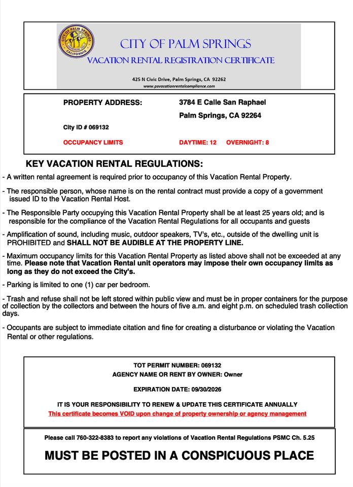 * **Pet-Friendly**: We are happy to welcome your furry friends to the Pop Art Oasis! Please let us know about your pet when booking. * **Pool & Spa Heating**: To ensure a comfortable and carefree stay, complimentary heating for both the pool and spa is included with your booking. * **City Registration**: City of Palm Springs Registration Number: 069132